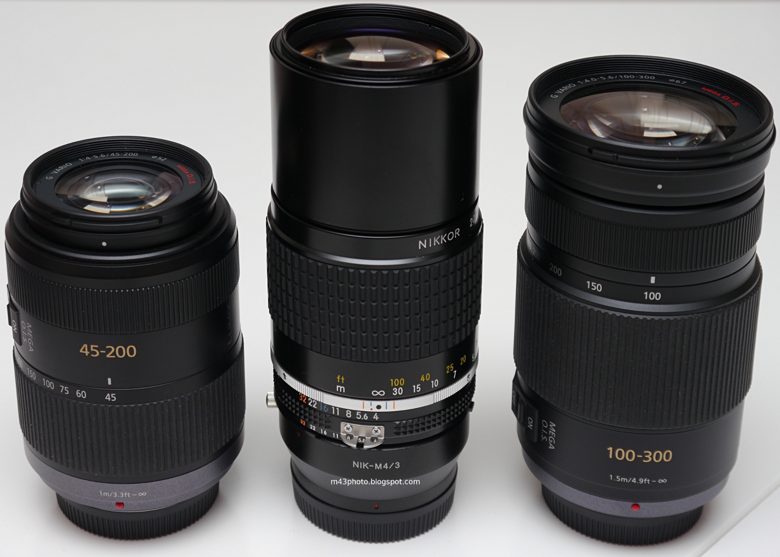 I decided to test the bokeh with some out of focus highlights. To do this, I photographed the same subject using three lenses, the Panasonic Lumix G 100-300mm f/4-5.6, Nikkor 200mm f/4 AIS, and Panasonic Lumix G 45-200mm f/4-5.6. The three lenses are shown below: